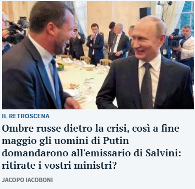 Πιο αναλυτικά, η εφημερίδα του Τορίνο γράφει στο φύλλο της Πέμπτης ότι στα τέλη Μαΐου ο Αντόνιο Καπουάνο, σύμβουλος διεθνών σχέσεων του γραμματέα της Λέγκα, Ματέο Σαλβίνι, συναντήθηκε με τον διπλωμάτη της ρωσικής πρεσβείας στην Ιταλία, Όλεγκ Κοστιούκοβ. Η La Stampa αναφέρεται σε στοιχεία και έγγραφα που, όπως γράφει, προέρχονται από τις ιταλικές μυστικές υπηρεσίες και προσθέτει ότι ο Κοστιούκοβ, σύμφωνα με τις πληροφορίες αυτές, «ρώτησε τον Καπουάνο αν η Λέγκα εννοούσε να αποσύρει τους υπουργούς της από την κυβέρνηση του Μάριο Ντράγκι».