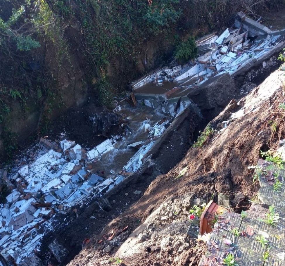 Εξαιτίας της συνεχιζόμενης κακοκαιρίας, στην κωμόπολη Σαντ Άγκατα Ντέι Γκότι της Κάτω Ιταλίας, στην ευρύτερη περιφέρεια της Νάπολης, κατέρρευσε σήμερα (19/1) τμήμα του τοπικού νεκροταφείου. Κύρια αιτία του συμβάντος, όπως φαίνεται, είναι η αύξηση της στάθμης του νερού σε παραπόταμο που βρίσκεται ακριβώς δίπλα στο νεκροταφείο.