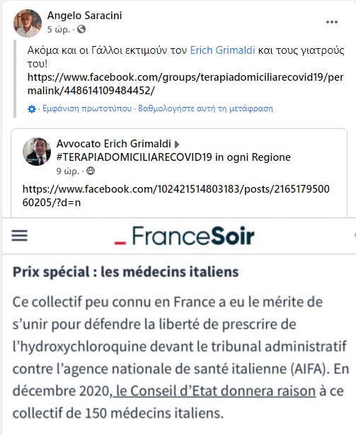 «Η διάσημη γαλλική εφημερίδα “FranceSoir” αποδίδει τα βραβεία στις προσωπικότητες του έτους 2020. Ένα ειδικό βραβείο, μεταξύ άλλων, απονέμεται στους 150 Ιταλούς γιατρούς, οι οποίοι εκπροσωπούνται από εμένα, ενώπιον του Συμβουλίου της Επικρατείας, και οι οποίοι κατάφεραν τελικά να μπορούν πια ελεύθερα να συνταγογραφούν προληπτικά υδροξυχλωροκίνη για τη θεραπεία του Covid-19, αφού η AIFA (Ιταλική Υπηρεσία Φαρμάκων) είχε αναστείλει χωρίς να δώσει εξηγήσεις τον πειραματισμό με τη συγκεκριμένη ουσία, ενώ είχε απαγορεύσει και τη συνταγογράφησή της.