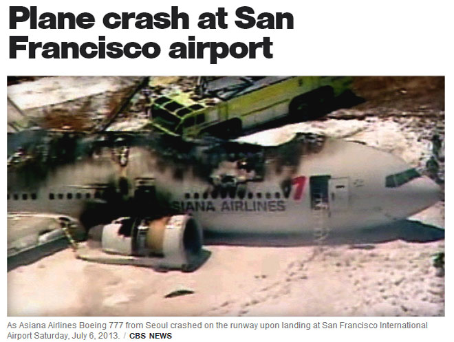 Η Αμερικανική Ομοσπονδιακή Υπηρεσία Πολιτικής Αεροπορίας (FAA) ανακοίνωσε ότι ένα αεροσκάφος Boeing 777-200 της κορεατικής αεροπορικής εταιρείας Asiana Airlines συνετρίβη το Σάββατο και έπιασε φωτιά στο διεθνές αεροδρόμιο του Σαν Φρανσίσκο των ΗΠΑ. Το αεροπλάνο αποπειράθηκε να πραγματοποιήσει κατεπείγουσα προσγείωση στις 11.20 (τοπική ώρα, 21.30 ώρα Ελλάδας). Πρόκειται για την πτήση 214 Σεούλ – Σαν Φρανσίσκο.