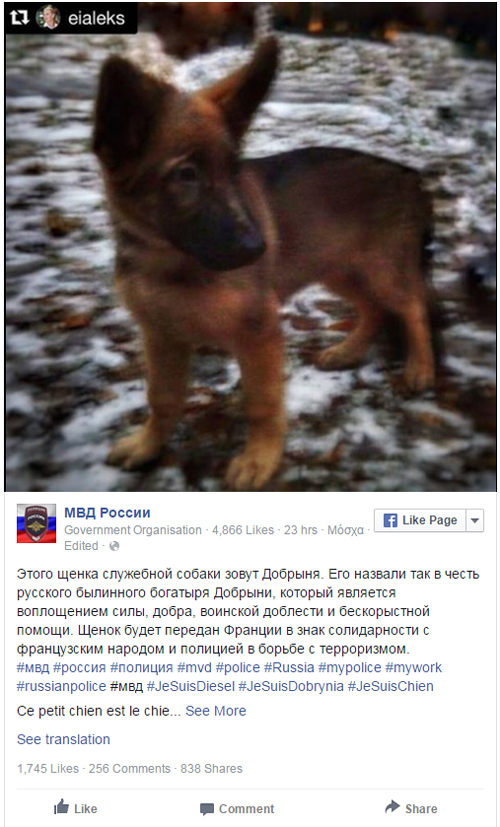 Η ανακοίνωση έγινε μέσω της σελίδας της ρωσικής αστυνομίας στο Facebook δύο μέρες αφότου χιλιάδες άνθρωποι απέτισαν φόρο τιμής στην Ντίζελ, το επτάχρονο βελγικό μαλινουά που τραυματίστηκε θανάσιμα την Τετάρτη, κατά την επιχείρηση των ειδικών δυνάμεων στο προάστιο Σεν Ντενί του Παρισιού.
