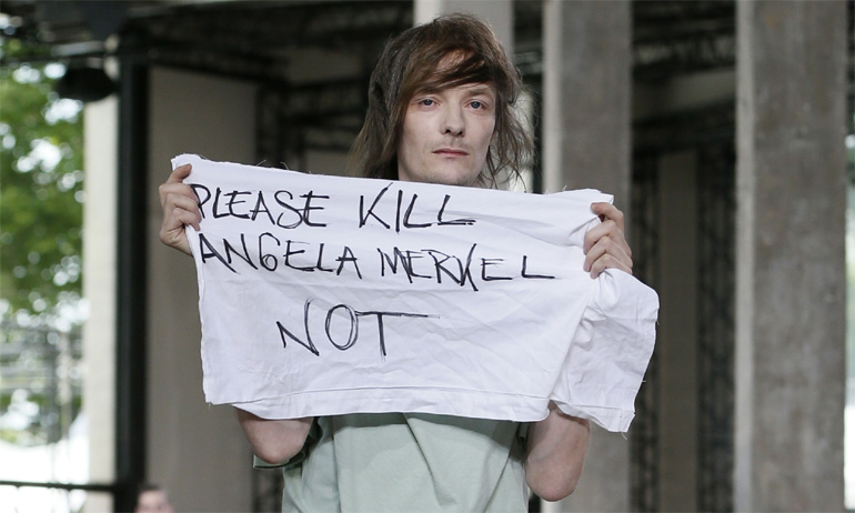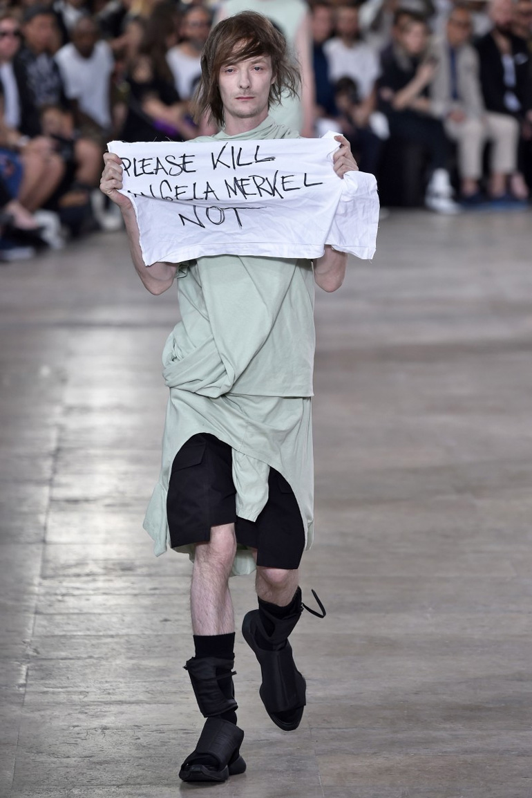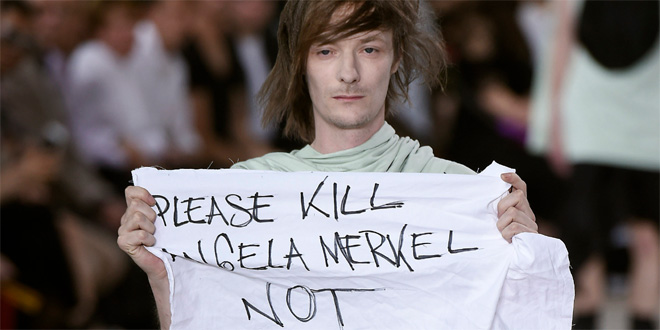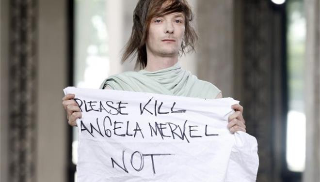 Κατά τη διάρκεια επίδειξης μόδας την Πέμπτη στο Παρίσι ο αντισυμβατικός δημιουργός έμεινε άφωνος όταν είδε το μοντέλο, ονόματι «Ζερά», να βγάζει ένα μικρό πανό την ώρα που περπατούσε στην πασαρέλα στο οποίο ήταν γραμμένη η φράση «Please Kill Angela Merkel (Παρακαλώ σκοτώστε την Άνγκελα Μέρκελ)» και η λέξη «not».