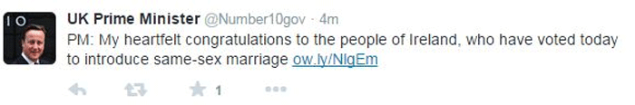 Συγχαρητήρια «από καρδιάς» έδωσε στους Ιρλανδούς για την ψήφο τους στο δημοψήφισμα υπέρ των γάμων ομοφυλοφίλων ο Βρετανός πρωθυπουργός Ντέιβιντ Κάμερον.