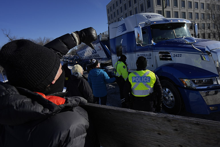 Είχε προηγηθεί μια τεταμένη αντιπαράθεση μεταξύ της καναδικής αστυνομίας και των διαδηλωτών το Σάββατο, καθώς η δικαστική εντολή και οι απειλές για συλλήψεις δεν κατάφεραν να τερματίσουν τον αποκλεισμό της γέφυρας στο Ουίντσορ, στο Οντάριο, ο οποίος εισήλθε πλέον στην έκτη ημέρα του.
