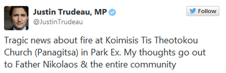 Συγκλονισμένοι είναι οι Έλληνες του Μόντρεαλ, που επί σαράντα χρόνια εκκλησιάζονται στην Παναγίτσα τους, ενώ ο Τζάστιν Τρουντό, ηγέτης των Φιλελευθέρων που εκλέγεται στην περιοχή, έγραψε στο τουίτερ: «Τραγική η καταστροφή της Παναγίτσας. Η σκέψη μου και οι προσευχές μου βρίσκονται με ολόκληρη την ελληνική κοινότητα και τον παπα-Νικόλα».