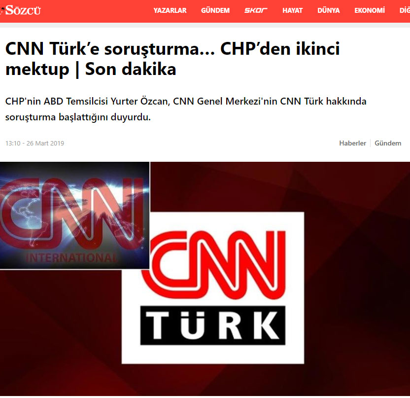 Ειδικότερα, ο Özcan απευθύνθηκε στο CNN International και κατήγγειλε ότι το «αδελφάκι» του CNN Turk μεταδίδει κατά συρροή ψευδείς και συκοφαντικές ειδήσεις σε βάρος της αντιπολίτευσης.