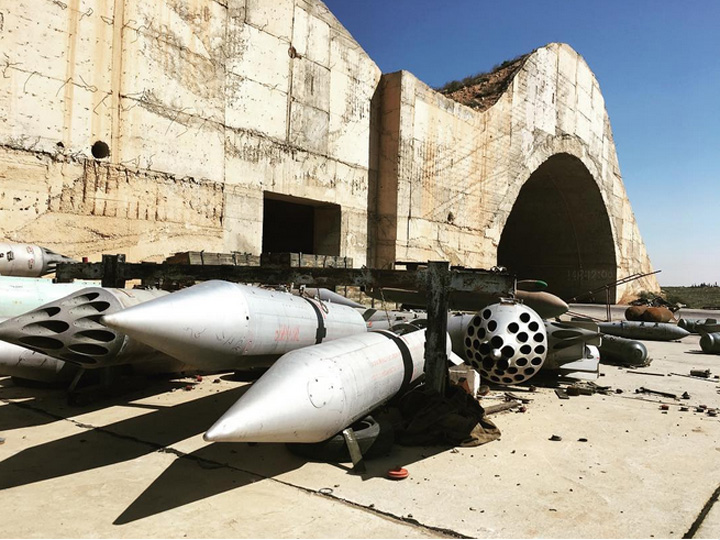 Το ενισχυμένο υπόστεγο της βάσης έχει σχεδόν καταστραφεί, καθώς το πάνω μέρος του εμφανίζεται να έχει υποστεί καίριο πλήγμα κατά τη διάρκεια της αμερικανικής πυραυλικής επίθεσηςΣε αποκλειστικά πλάνα που μετέδωσε το κανάλι Rossiya 24 από την πληγείσα βάση εμφανίζονται κομμάτια από μαχητικά αεροσκάφη διάσπαρτα πεσμένα στο έδαφος, αναμεμιγμένα με διάφορα υλικά, σκόνη και θραύσματα γυαλιών.