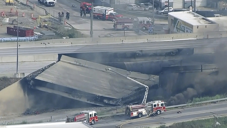 Οι εικόνες που μεταδόθηκαν από τα τηλεοπτικά δίκτυα έδειξαν τεράστιο σύννεφο μαύρου καπνού και την κατάρρευση τεσσάρων λωρίδων της κυκλοφορίας επάνω σε δευτερεύοντα δρόμο που βρίσκεται κάτω από τον I-95 στο σημείο της πυρκαγιάς.