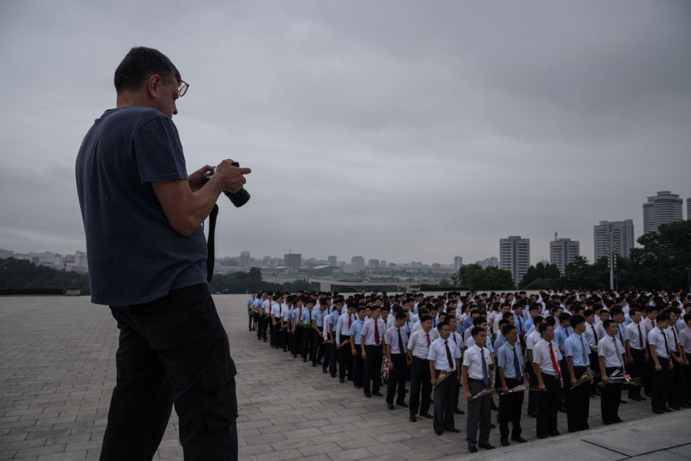 Φωτογράφος ετοιμάζεται να απαθανατίσει ομάδα πολιτών που συγκεντρώθηκαν να αποτίσουν φόρο τιμής μπροστά στο άγαλμα των αποθανόντων Βορειοκορεατών ηγετών Κιμ Ιλ-Σουνγκ και Κιμ Γιονγκ-Ιλ, (πατέρα και γιου), στο λόφο Μανσού της Πιονγκγιάνγκ στις 23 Ιουλίου.