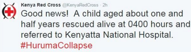 Σύμφωνα με ανακοίνωση του Ερυθρού Σταυρού της Κένυας, το παιδί διασώθηκε 72 ώρες μετά τη σφοδρή βροχόπτωση που έπληξε την περιοχή και είχε ως αποτέλεσμα την κατάρρευση του κτηρίου.