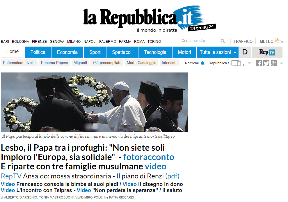 Η «Λα Ρεπούμπλικα», στην ηλεκτρονική της έκδοση, προβάλλει τον απλό όσο και περιεκτικό τρόπο με τον οποίο ο ποντίφικας θέλησε να ευχαριστήσει τη χώρα μας για την αλληλεγγύη και τη βοήθεια που προσέφερε, συνοψίζοντας την ομιλία του με δύο μόνο λέξεις: «Grazie, Grecia» (σ.σ.: «Ευχαριστώ, Ελλάδα»).