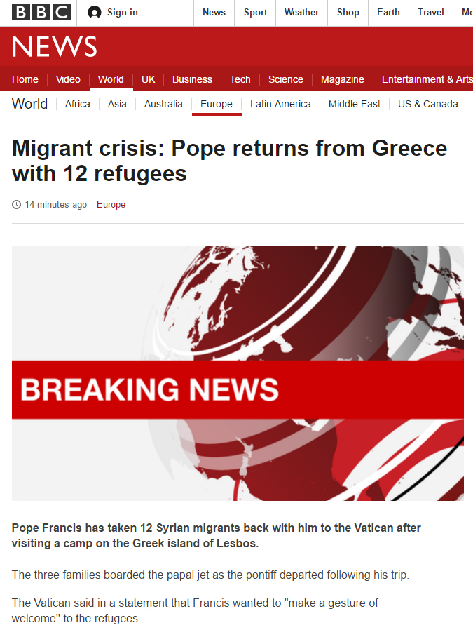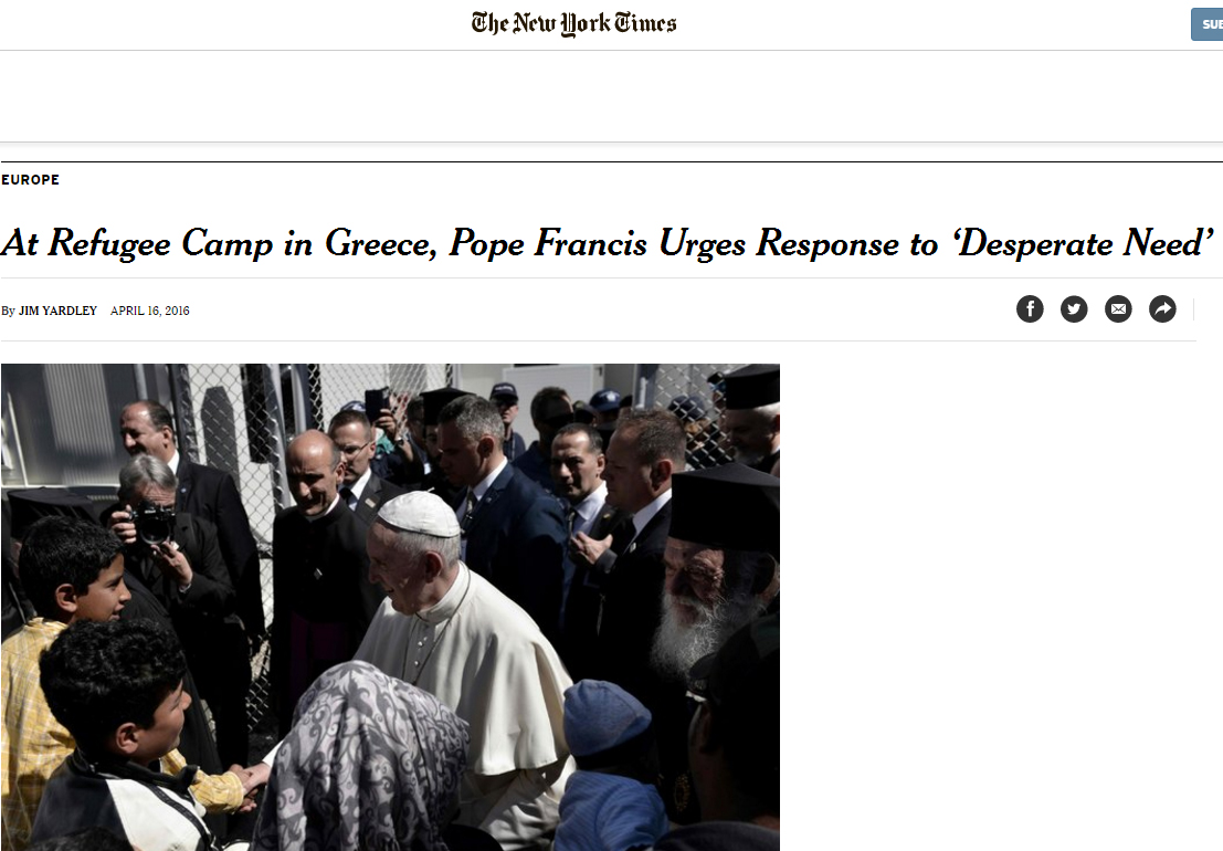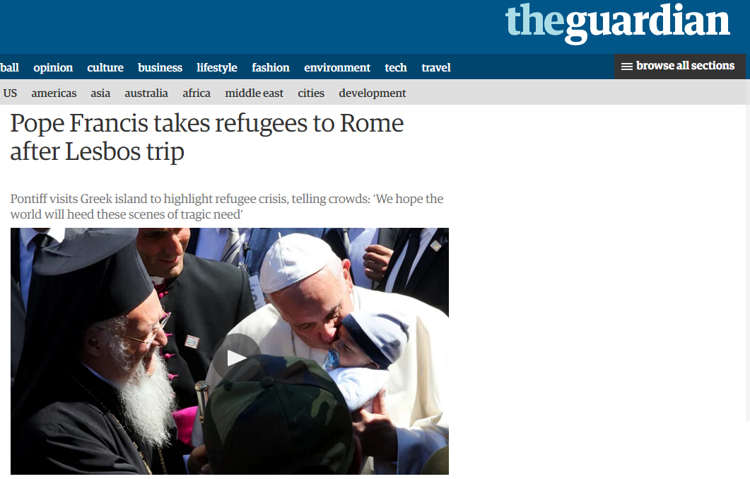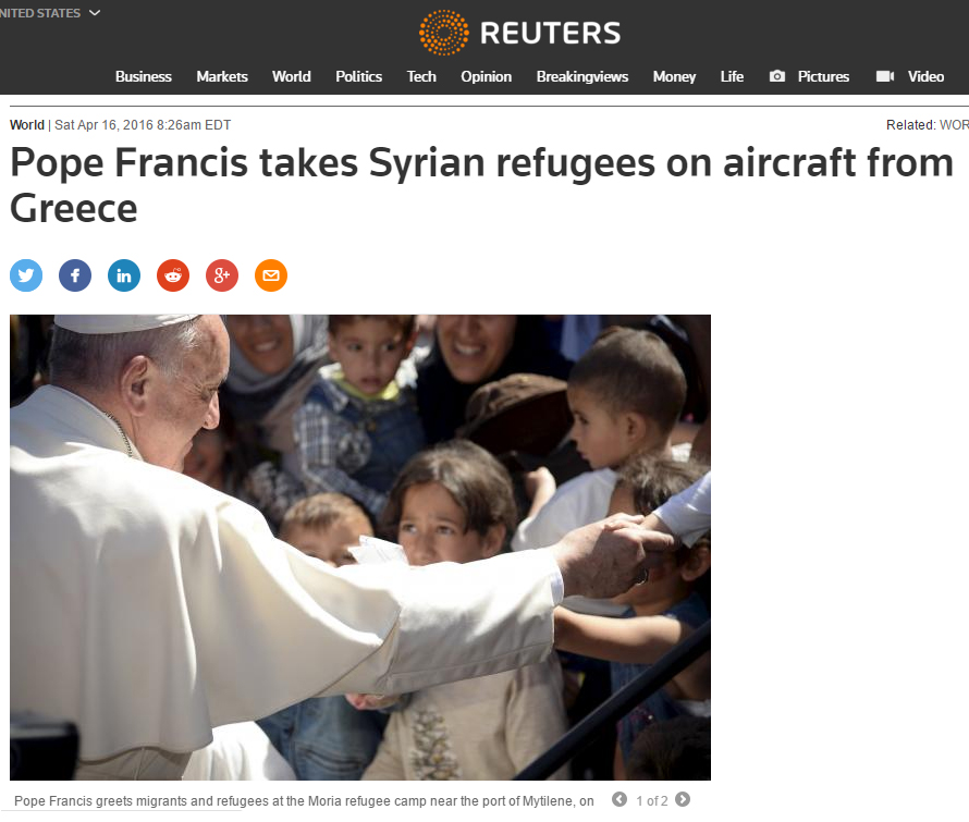 Τα δημοσιεύματα εστιάζονται επίσης στην απόφαση του πάπα Φραγκίσκου να πάρει μαζί του στο Βατικανό, φεύγοντας από τη Λέσβο, δέκα πρόσφυγες.