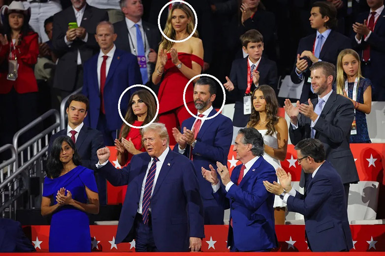 Ντυμένη δελεαστικά με μια κόκκινη τουαλέτα έξω από τους ώμους, η Bettina κάθισε σε κοντινή απόσταση από τη γυναίκα που την έχει πλέον αντικαταστήσει στην αγκαλιά του Don Jr.