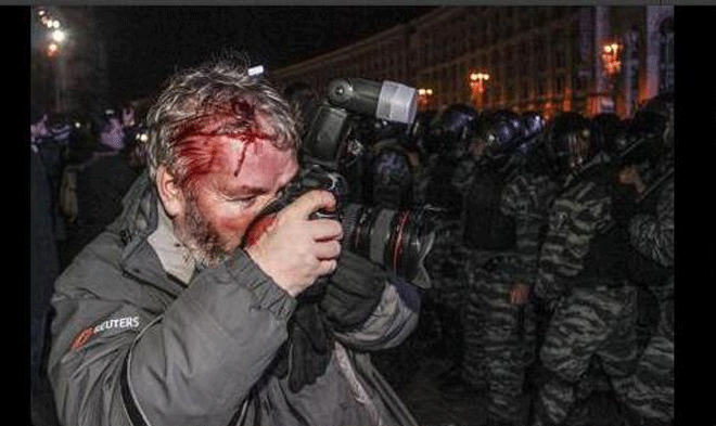 Εικόνες με φωτορεπόρτερ να προσπαθούν να κάνουν τη δουλειά τους, έχοντας αίματα στο κεφάλι τους, συνεχίζουν να κάνουν τον γύρο του κόσμου.