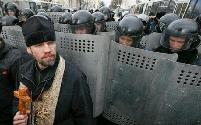 Εντύπωση προκαλεί το γεγονός πως ανάμεσα στους διαδηλωτές υπάρχουν και ιερείς, οι οποίοι κρατούν σταυρούς και άλλα χριστιανικά σύμβολα στα χέρια τους, την ίδια στιγμή που απέναντί τους βρίσκονται παρατεταγμένοι αστυνομικοί με τις ασπίδες και τα γκλοπ σε ετοιμότητα.