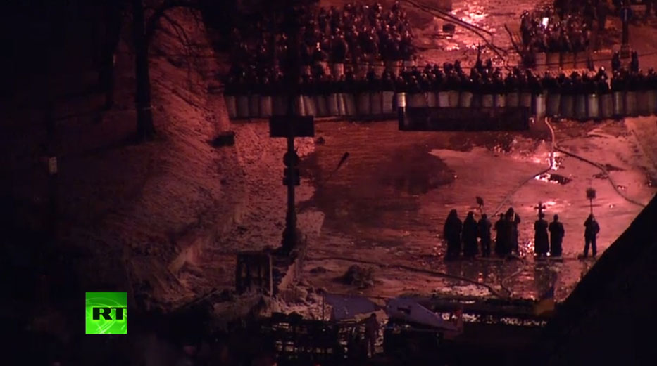 Η κατάσταση στην πλατεία της Ανεξαρτησίας παραπέμπει σε πεδίο μάχης, καθώς αστυνομικοί έχουν παραταχθεί απέναντι από τα οδοφράγματα των διαδηλωτών, σε μια «εύθραυστη» ισορροπία, η οποία μπορεί να ανατραπεί ανά πάσα στιγμή, καθώς η κατάσταση παραμένει τεταμένη. Όπως δήλωσε τις πρώτες πρωινές ώρες της Παρασκευής ο Βιτάλι Κλίτσκο, ηγετικό στέλεχος της Αντιπολίτευσης, υπήρξε αδιέξοδο κατά τη διάρκεια των συνομιλιών με το κυβερνητικό επιτελείο και πλέον δεν αποκλείεται να ακολουθήσει ενός των επόμενων ωρών νέο αιματοκύλισμα στους δρόμους του Κιέβου.