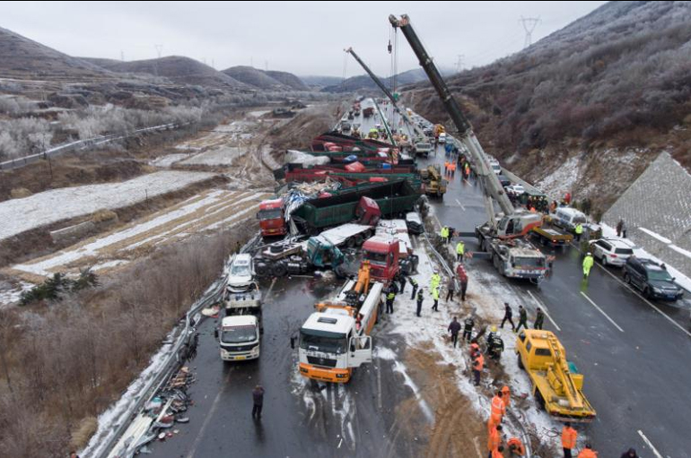 Εικόνες που μετέδωσε το Xinhua δείχνουν περίπου 10 φορτηγά στοιβαγμένα το ένα πάνω στο άλλο, στο οδόστρωμα που ήταν ελαφρώς χιονισμένο.