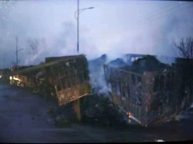 Από την έκρηξη κάηκαν τουλάχιστον 38 μεγάλα φορτηγά και 12 αυτοκίνητα.