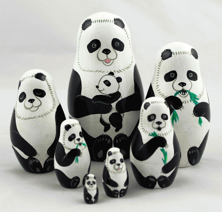 Με τους χαρακτηριστικούς μαύρους κύκλους γύρω από τα μάτια τους και κρατώντας ένα κλαδί μπαμπού, οι εννέα φιγούρες των πάντα έχουν διαφορετικά μεγέθη, προκειμένου να χωρά η μία μέσα στην άλλη. Οι κούκλες ματριόσκα με τη μορφή πάντα κατασκευάστηκαν από τον Γου Χονγκλόνγκ, ιδιοκτήτη εργαστηρίου στη Γιμιανπό, στη βορειοδυτική επαρχία Χεϊλονγκτζιάνγκ.
