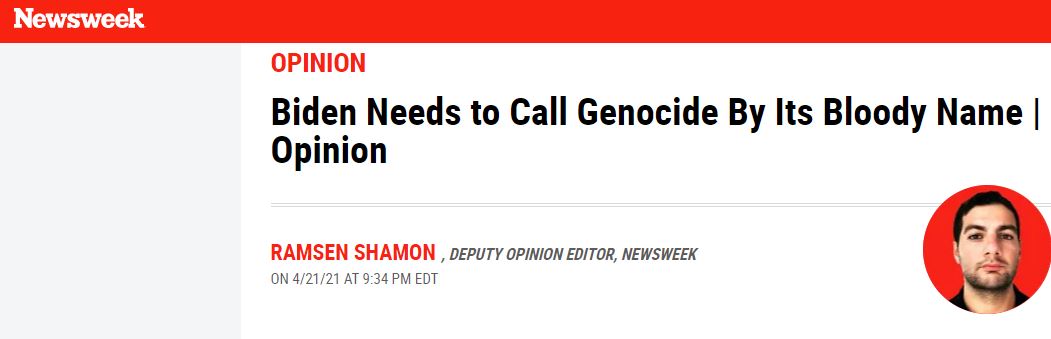 Την ίδια ημέρα, στην ηλεκτρονική πια έκδοσή του, το Newsweek, που απευθύνεται στη μεγάλη λαϊκή μάζα των αμερικανικών δημοκρατικών που ψήφισαν Μπάιντεν στις πρόσφατες εκλογές αναδεικνύοντας μια νέα πολιτική πλειοψηφία στις ΗΠΑ, με πρωτοσέλιδη καταχώριση του μόνιμου αρθρογράφου του Ράμσεν Σαμόν, καλεί τον Τζο Μπάιντεν να «αποκαλέσει τη γενοκτονία με το αιματοβαμμένο όνομά της».