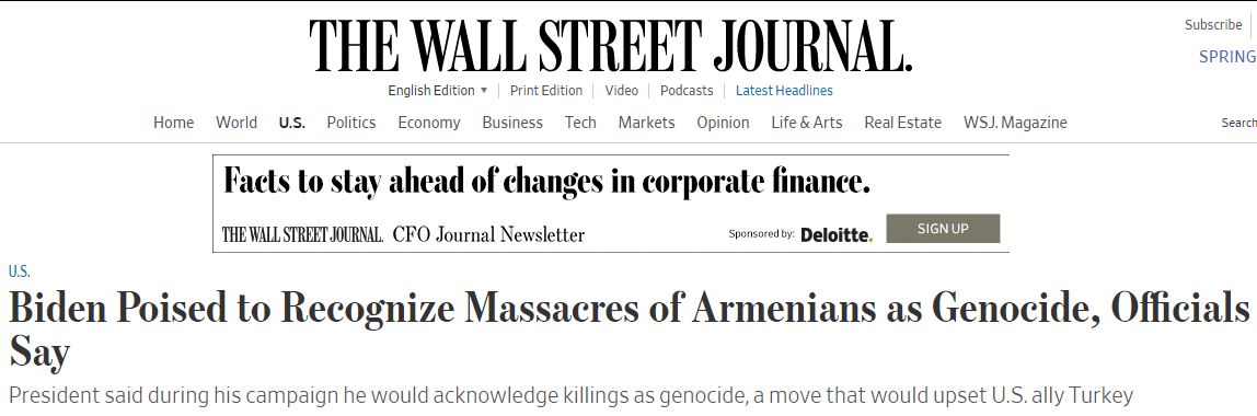 Συγκεκριμένα η Wall Street Journal, που απευθύνεται στο συντηρητικό επιχειρηματικό κοινό των ΗΠΑ και εκφράζει το συντηρητικό εβραϊκό λόμπι, προαναγγέλλει την αναγνώριση της γενοκτονίας των Αρμενίων για το ερχόμενο Σάββατο, ενώ σε πρωτοσέλιδο δημοσίευμα οι New York Times, που απευθύνονται στην προοδευτική ελίτ των ΗΠΑ και εκφράζουν το προοδευτικό εβραϊκό λόμπι, αφιερώνουν εκτενές άρθρο, εξηγώντας τη σημασία της αναγνώρισης της γενοκτονίας των Αρμενίων και τις επιπτώσεις που θα έχει μια τέτοια ενέργεια στις αμερικανοτουρκικές σχέσεις.