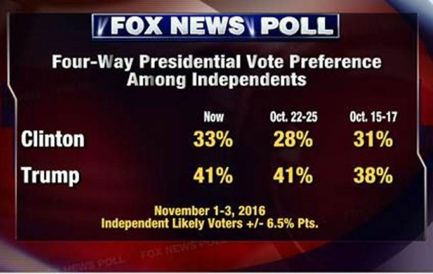 Προβάδισμα 8 μονάδων διατηρεί ο Τραμπ -και αυτό κρίνεται ιδιαιτέρως σημαντικό από τους ειδικούς αναλυτές των αμερικανικών εκλογών- έναντι της Κλίντον μεταξύ των ανεξάρτητων ψηφοφόρων (41% – 33%).