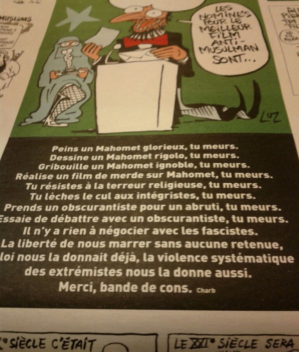 Τώρα, σε μια – τουλάχιστον – «ευαίσθητη» διεθνή συγκυρία, καθώς ο αραβικός «κόσμος» βράζει κατά της Δύσης μετά την ταινία που προσβάλλει τον προφήτη Μωάμεθ, το «Charlie Hebdo» αποφάσισε να δημοσιεύσει κι άλλες καρικατούρες του Μωάμεθ. Τον δείχνει γυμνό, να κοροϊδεύει την ταινία σαν να κάνει απονομή Όσκαρ, μεταξύ άλλων. Φυσικά, το περιοδικό έγινε ανάρπαστο σε ανύποπτο χρόνο.