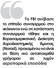 Το FBI ανέβασε το επίπεδο συναγερμού στο «κόκκινο», ενώ σε κατάσταση συναγερμού τέθηκε και η Βορειοαμερικανική Διοίκηση Αεροδιαστημικής Άμυνας (Norad), προκειμένου να είναι σε θέση «να ανταποκριθεί γρήγορα» σε τυχόν αεροπορικά επεισόδια που θα μπορούσαν να ακολουθήσουν την επίθεση.