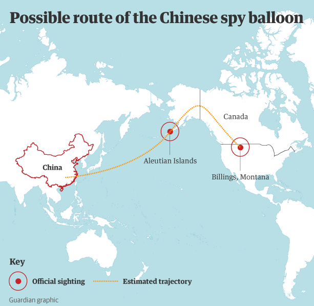 Αμερικανοί αξιωματούχοι δήλωσαν ότι το αερόστατο παρακολουθείτο εδώ και μέρες, από την στιγμή που εισήλθε στον εναέριο χώρο των ΗΠΑ. Χρησιμοποιήθηκαν διάφορες μέθοδοι επιτήρησης, συμπεριλαμβανομένων μαχητικών αεροσκαφών. Το πιο πρόσφατο «στίγμα» του μπαλονιού ήταν πάνω από την Μοντάνα όπου υπάρχει η βάση των σιλό με τους πυραύλους. Αυτό οδήγησε, μάλιστα, και στην ματαίωση των πτήσεων από το αεροδρόμιο της πόλης Μπίλινγκς. Όπως ανέφεραν οι αξιωματούχοι, το μπαλόνι διέσχισε τον Καναδά πριν μπει στον αμερικανικό εναέριο χώρο, κάτι που επιβεβαίωσε με ανακοίνωση του και το καναδικό υπουργείο Άμυνας.