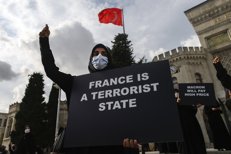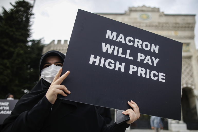 Διαδηλωτές στην πλατεία Μπεγιαζίτ, στην ευρωπαϊκή πλευρά της πόλης, κρατούσαν πλακάτ στα οποία έγραφαν απειλές προς την εφημερίδα και τον Γάλλο πρόεδρο Εμανουέλ Μακρόν ότι “πρέπει να πληρώσουν ακριβά”.