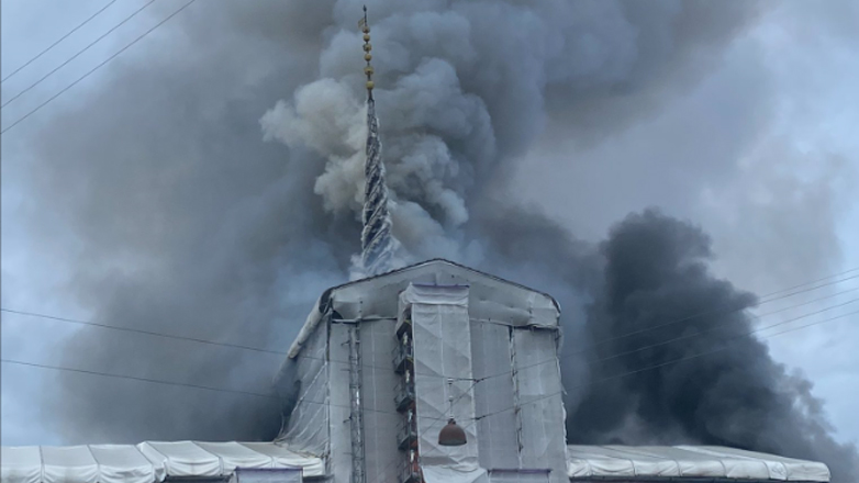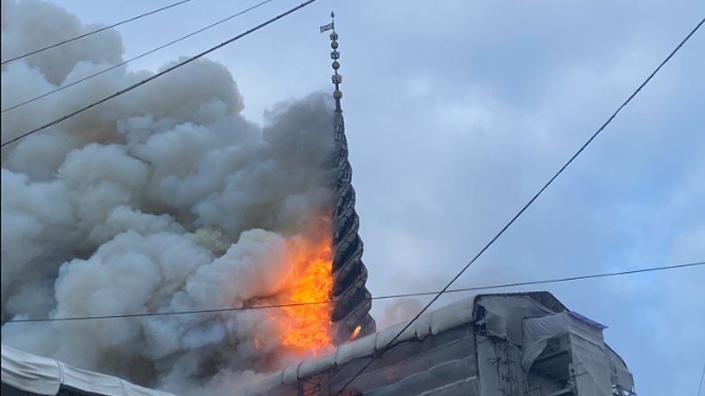 Το κτήριο Børsen του 17ου αιώνα, ένα από τα παλαιότερα κτήρια της πόλης, τυλίχτηκε τα ξημερώματα στις φλόγες και το εμβληματικό του κωδωνοστάσιο κατέρρευσε, ενώ οι Δανοί παρακολουθούσαν τις συγκλονιστικές εικόνες με κομμένη την ανάσα.