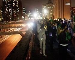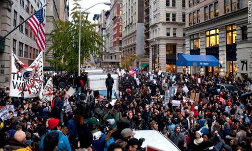 Αμέσως μετά την ολοκλήρωση της χθεσινής συνεδρίασης, ξεκίνησε πορεία διαμαρτυρίας προς τη γέφυρα του Μπρούκλιν με τη συμμετοχή τουλάχιστον 10.000 διαδηλωτών, σύμφωνα με την αμερικανική εφημερίδα «The New York Times». Οι διαδηλωτές αφού κατέλαβαν την πλατεία Φόλεϊ, στο νότιο Μανχάταν, στη συνέχεια άρχισαν να περπατούν κατά μήκος των λωρίδων της γέφυρας, που προορίζονται για τα ποδήλατα και τους πεζούς, χωρίς να αναστατώσουν την κυκλοφορία των οχημάτων.
