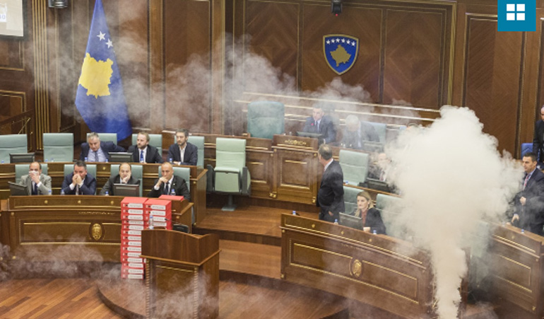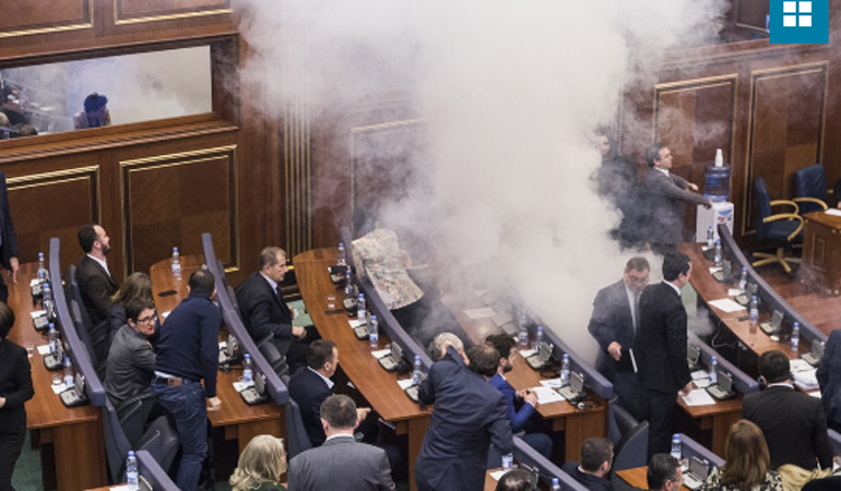 Αρχικά ερρίφθη ένα δακρυγόνο, την ώρα που οι βουλευτές ετοιμάζονταν να ψηφίσουν. Ο πρόεδρος του κοινοβουλίου ανέβαλε τη συνεδρίαση μέχρι να αεριστεί επαρκώς ο χώρος και η συνεδρίαση ξανάρχισε γύρω στις 02.15 (ώρα Ελλάδας). Τότε εκτοξεύτηκε και δεύτερο δακρυγόνο, αναγκάζοντας τους βουλευτές να φύγουν βιαστικά από την αίθουσα. Αστυνομικοί εφοδιασμένοι με αντιασφυξιογόνες μάσκες ανέλαβαν να ερευνήσουν τα έδρανα του κόμματος Vetevendosje.