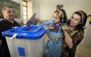 Μια γιορτινή ατμόσφαιρα φαινόταν να καλύπτει όλη την πόλη του Ερμπίλ το πρωινό της Δευτέρας. Οι κάτοικοι, άνδρες και γυναίκες, αλλά και τα πιτσιρίκια φόρεσαν τα καλά τους ρούχα, στολίστηκαν και βγήκαν στους δρόμους με προορισμό τα εκλογικά τμήματα.