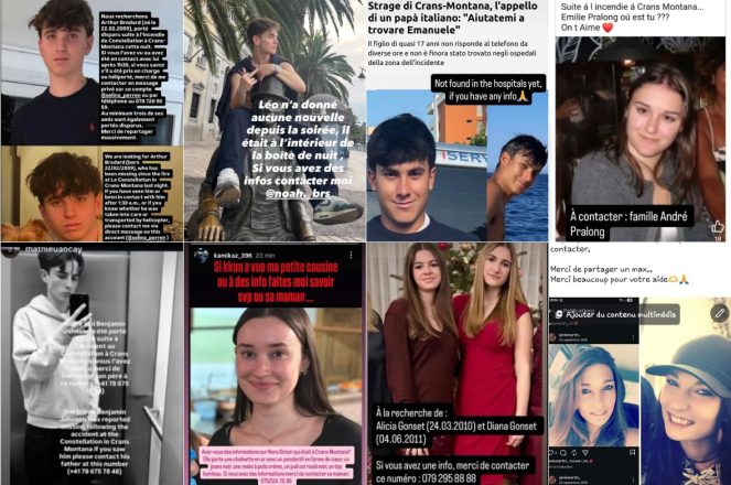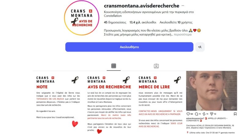 «Η ηλικίας 15 ετών αδελφή μου, Άλικη Καλλέργη, είναι αγνοούμενη. Δεν έχουμε νέα της από τη στιγμή που ξέσπασε η πυρκαγιά σε ένα μπαρ στο Κραν Μοντανά . Εάν την έχετε δει ή αν γνωρίζετε ότι έχει μεταφερθεί κάπου για να της παρασχεθεί βοήθεια παρακαλώ να με ενημερώσετε στο +41789040021. Παρακαλώ μοιραστείτε αυτό το μήνυμα με όσους περισσοτερους ανθρώπους μπορείτε. Βρισκόταν εκεί με τρεις φίλους, οι οποιοι επίσης είναι αγνοούμενοι» αναφέρει.