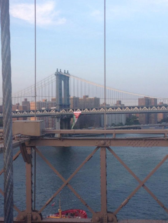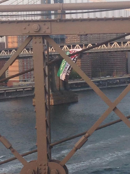 Ακτιβιστές υπέρ των Παλαιστινίων της Γάζας κρέμασαν το βράδυ της Τετάρτης μια τεράστια σημαία της Παλαιστίνης από τη γέφυρα του Μανχάταν και φώναξαν συνθήματα κατά του Ισραήλ.