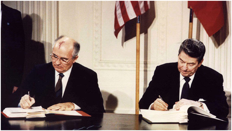 Οι τότε πρόεδροι Ρίγκαν των ΗΠΑ και Γκορμπατσόφ της ΕΣΣΔ, είχαν υπογράψει την ιστορική συμφωνία το 1987, η οποία και είχε τεθεί σε εφαρμογή από τον επόμενο χρόνο. Για να σημάνει τον τερματισμό των εξοπλισμών του Ψυχρού Πολέμου από τις δύο -τότε- υπερδυνάμεις.