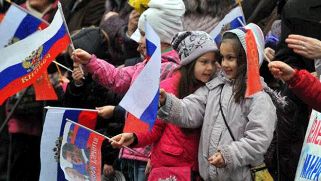 (Παιδιά με ρωσικές σημαίες σε διαδήλωση στο κέντρο της Σεβαστούπολης προχτές)