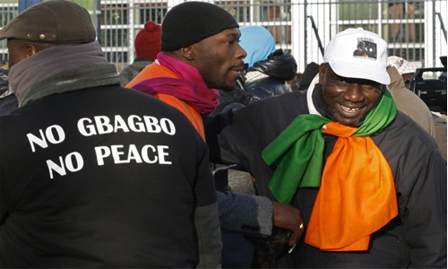 Εν τω μεταξύ το Σάββατο, εκατοντάδες υποστηρικτές του Laurent Gbagbo διαδήλωσαν έξω από το Διεθνές Δικαστήριο της Χάγης, ζητώντας την απαλλαγή του από τις κατηγορίες που τον βαρύνουν. Ορισμένοι μάλιστα από τους οπαδούς του φορούσαν και μπλουζάκια πάνω στα οποία αναγραφόταν η φράση «Όχι Gbagbo, όχι Ειρήνη».