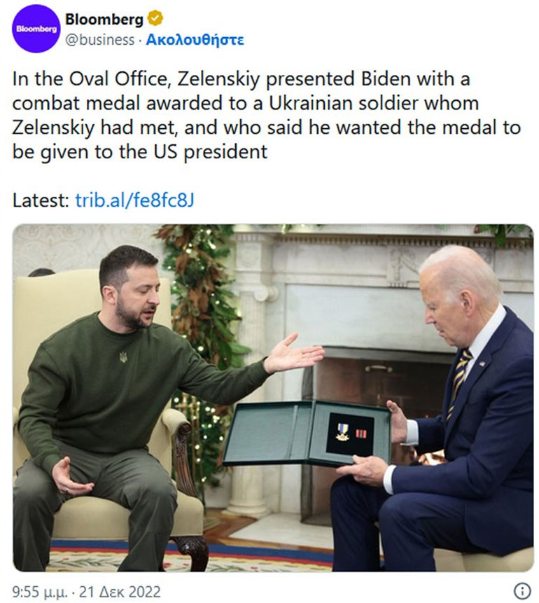 Στη συνέχεια, ο Ουκρανός πρόεδρος παρέδωσε στον ομόλογό του των ΗΠΑ ένα στρατιωτικό μετάλλιο από έναν Ουκρανό στρατιώτη στο Μπαχμούτ.