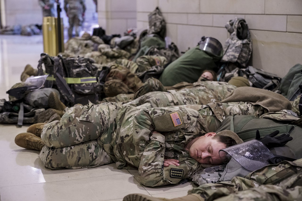 Δείτε φωτογραφίες από το εσωτερικό του κτηρίου, όπου βρίσκονται στρατιώτες της Εθνοφρουράς σε επιφυλακή, με πλήρη εξάρτυση: