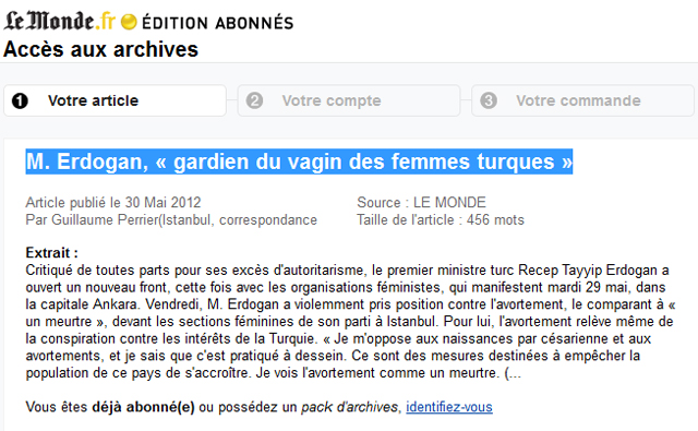 Χαρακτηριστικός είναι ο τίτλος της γαλλικής «Le Monde», που σε άρθρο της στη συνδρομητική της έκδοση στις 31 Μαΐου χαρακτηρίζει τον Ερντογάν ως «φύλακα του κόλπου των γυναικών της Τουρκίας». Η εφημερίδα κάνει λόγο για «αυταρχισμό» του Τούρκου πρωθυπουργού, ο οποίος «άνοιξε ακόμη ένα μέτωπο, αυτή τη φορά με τις γυναικείες οργανώσεις».