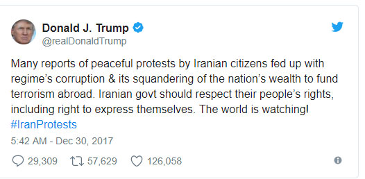Είναι ενδεικτικό ότι με δικό του tweet, ο πρόεδρος των ΗΠΑ Ντόναλντ Τραμπ, παρενέβη στην υπόθεση προειδοποιώντας το καθεστώς της Τεχεράνης πως θα πρέπει να αποφύγει την καταστολή της κοινωνικής διαμαρτυρίας και κυρίως να μην τολμήσει να αντιμετωπίσει βιαίως τους χιλιάδες διαδηλωτές.