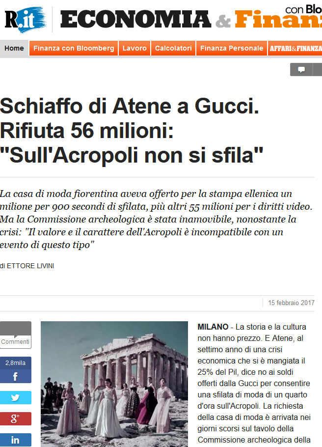 Στην απόφαση να απορριφθεί το αίτημα του οίκου μόδας Gucci, σε ό,τι αφορά τη δυνατότητα διεξαγωγής επίδειξης μόδας στην Ακρόπολη, αφιερώνει σήμερα άρθρο της η ιταλική εφημερίδα La Repubblica.