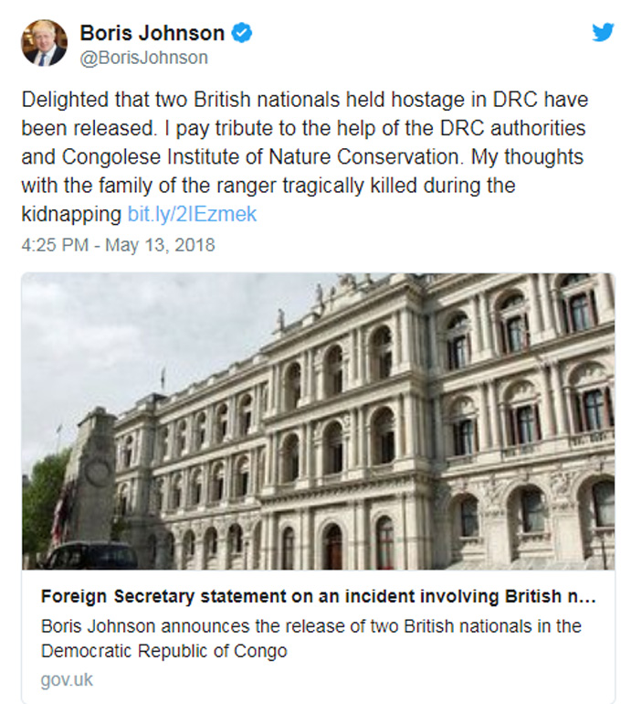 Οι δύο Βρετανοί που κρατούνταν όμηροι στη Λαϊκή Δημοκρατία του Κονγκό, απελευθερώθηκαν, σύμφωνα με τον Βρετανό υπουργό των Εξωτερικών Μπόρις Τζόνσον.