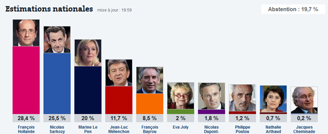 Σύμφωνα με τη γαλλική «Le Monde», ο Ολάντ λαμβάνει το 28,4%, ο δεξιός Γάλλος πρόεδρος έρχεται δεύτερος με 25,5%, ενώ εντυπωσιακά υψηλό είναι το ποσοστό της Μαρίν Λε Πεν, που αγγίζει το 20%. Τέταρτος έρχεται ο υποψήφιος της αριστεράς Ζαν-Λικ Μελανσόν με 11,7% και πέμπτος ο κεντρώος Φρανσουά Μπαϊρού με 8,5%. Η υποψήφια των Πρασίνων Εύα Ζολί περιορίζεται στο 2%, ο εθνικιστής δεξιός Νικολά Ντιπόν-Ενιάν στο 1,8%, ο υποψήφιος της άκρας αριστεράς Φιλίπ Πουτού στο 1,2%, η επίσης αριστερή υποψήφια Ναταλί Αρτό στο 0,7% και ο υπεραμυνόμενος της παγκόσμιας ολιγαρχίας Ζακ Σεμινάντ στο 0,2%.