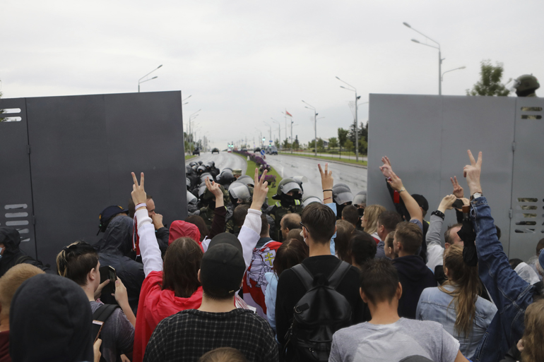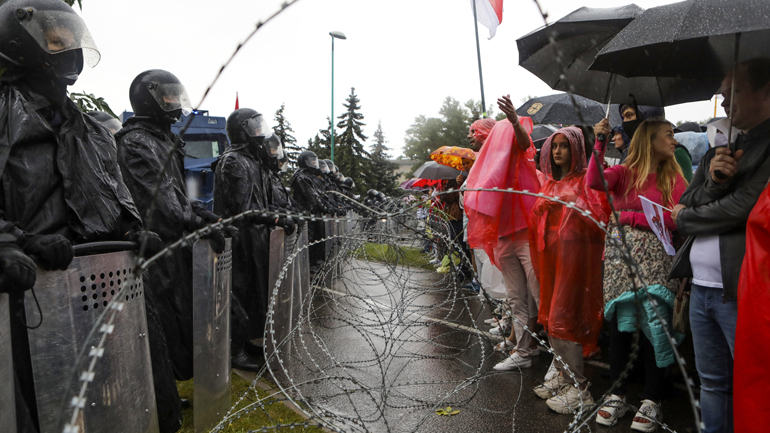 Πλάνα από τον τοπικό ιστότοπο TUT.BY έδειξαν έναν μασκοφόρο να χτυπά έναν διαδηλωτή καθώς ο τελευταίος βρισκόταν στο οδόστρωμα. Αστυνομικοί με πολιτικά φαίνονταν να σπάνε τη γυάλινη πόρτα μιας καφετέριας για να συλλάβουν διαδηλωτές που είχαν αναζητήσει καταφύγιο στο εσωτερικό. «Τρέξαμε να μπούμε στην καφετέρια για να κρυφτούμε από την αστυνομία, έσπασαν το τζάμι, όρμησαν μέσα, έβγαλαν με τη βία τρεις ανθρώπους, χτύπησαν τουλάχιστον έναν», λέει ο Εβγκένι, ένας 28χρονος διαδηλωτής, ενώ οι σερβιτόροι καθαρίζουν τα σπασμένα γυαλιά.