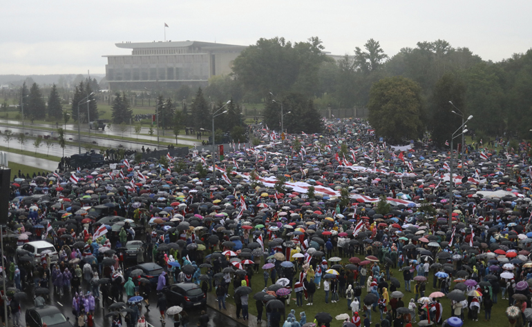 Σχεδόν έναν μήνα μετά τις προεδρικές εκλογές της 9ης Αυγούστου που κέρδισε ο Λουκασένκο με συντριπτική πλειοψηφία και οι οποίες σύμφωνα με τους αντιπάλους του ήταν νοθευμένες, δεκάδες χιλιάδες άνθρωποι πορεύθηκαν στους δρόμους του Μινσκ, πολλοί στα ερυθρόλευκα χρώματα της αντιπολίτευσης φωνάζοντας «Φύγε!» και «Ρουφιάνε!».