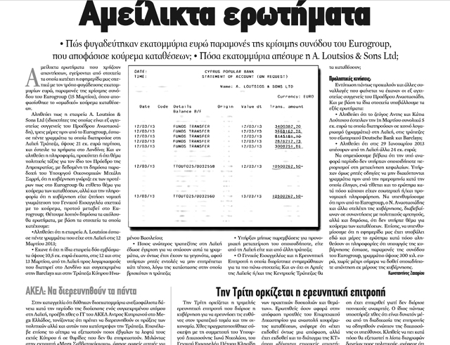 Σύμφωνα με το ίδιο δημοσίευμα, η εν λόγω εταιρεία στις 12 Μαρτίου -τρεις ημέρες πριν από το κρίσιμο Εurogroup όπου ελήφθησαν οι αποφάσεις για το κούρεμα καταθέσεων- «έσπασε» πέντε έντοκα γραμμάτια που είχε στη Λαϊκή Τράπεζα και έστειλε τα χρήματα στο Λονδίνο.