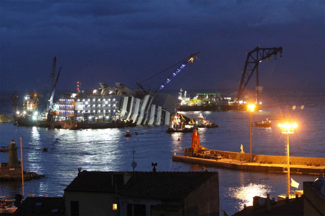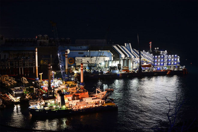 Η επιχείρηση ρυμούλκησης του κρουαζιερόπλοιου Costa Concordia, που ξεκίνησε στις 9.00 το πρωί (τοπική ώρα) της Δευτέρας, συνεχίζεται καθ’ όλη την διάρκεια της νύχτας, σύμφωνα με τον υπεύθυνο της ιταλικής Υπηρεσίας Πολιτικής Προστασίας Φράνκο Γκαμπριέλι.